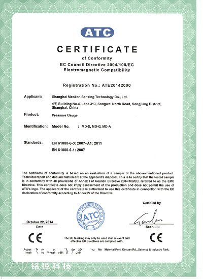2014年10月,新款的MD-S280數(shù)字壓力表/MD-S200數(shù)字壓力表通過ATC實(shí)驗(yàn)室CE認(rèn)證。